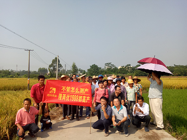 2017年10月25日,在化州市代理商李總的組織下,化州市南盛鎮(zhèn)迎來了50余位來自各鄉(xiāng)鎮(zhèn)的零售商和種植專業(yè)戶,一起觀摩隆兩優(yōu)1988的田間表現(xiàn)。