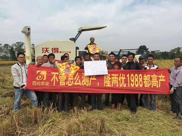 早上8點(diǎn)30分,田間地頭就聚集了幾十號(hào)人,現(xiàn)場(chǎng)熱鬧非凡,大家興致頗高!原來,前段時(shí)間雨水非常多,80%的品種都有倒伏現(xiàn)象,財(cái)神稻依然巋然不動(dòng),表現(xiàn)出極高的品種優(yōu)異性。現(xiàn)場(chǎng)大家看到財(cái)神稻穗大粒多,產(chǎn)量肯定不低,在區(qū)域負(fù)責(zé)人賴經(jīng)理給大家簡(jiǎn)單講解品種特性期間,大家就迫不及待地預(yù)測(cè)這塊田的畝產(chǎn)量,有的說1400斤,有的說1600斤,而經(jīng)驗(yàn)豐富的楊總卻估產(chǎn)1800斤!在場(chǎng)的所有人都不相信!眼見為實(shí),讓數(shù)據(jù)說話,大家趕緊讓收割機(jī)登場(chǎng),轟隆隆的聲音仿佛在述說著豐收的喜悅,一會(huì)兒功夫,收割完畢,大家熱火朝天的幫忙稱量,最后的數(shù)據(jù)出乎大家意料,竟然畝產(chǎn)干谷1830斤,真是名副其實(shí)的財(cái)神稻!