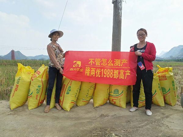 下午收割機到來,轟隆的氣笛聲中一袋袋谷子入袋,豐收的喜悅再也無法將臉上的笑容掩蓋,大家紛紛豎起大拇指,這產量就是高啊,隊長大聲地問到:“隆兩優(yōu)1988種不種?”“種!”洪亮的聲音響滿田間地頭,讓笑容齊飛,迎接豐收。