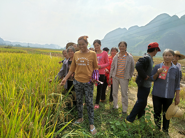 10月30日,在田東經銷商馬紅艷的組織下來到這個美麗的新農村,隆兩優(yōu)1988優(yōu)秀的田間表現吸引了全村7個小組80余種植戶參加了此次觀摩會。田間隊伍龐大,浩浩蕩蕩匯集媽慶(壯語稱呼)阿姨位于中心的田塊。由于人數多,各小組隊長自發(fā)組織好各小組簽到,會場整齊有序。