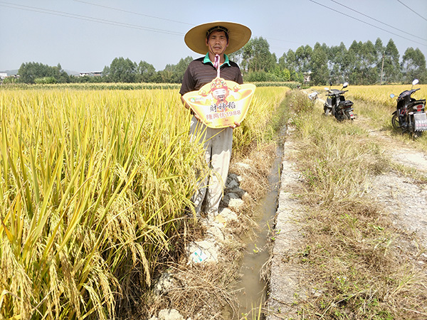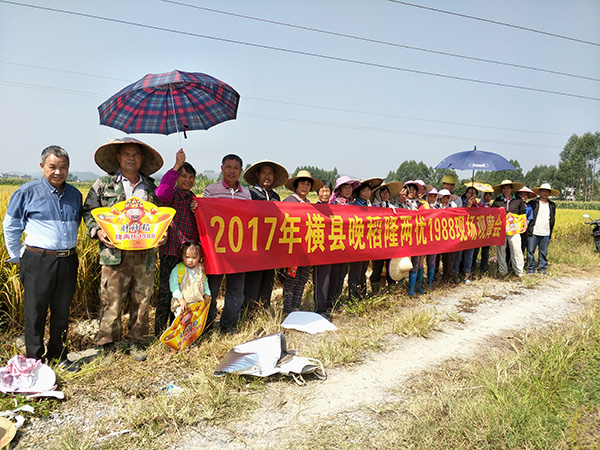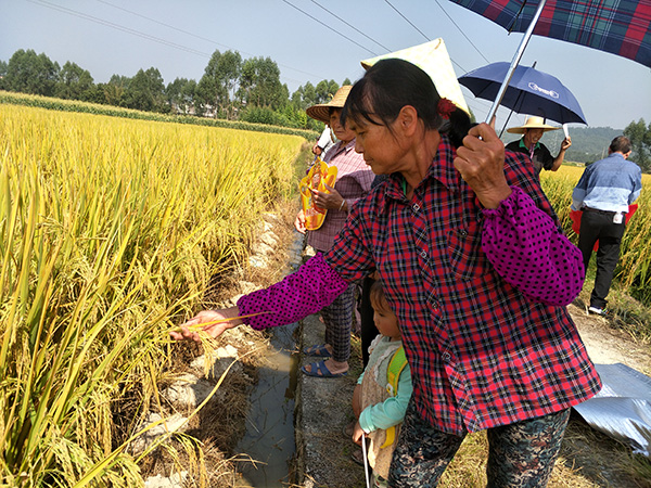 此次觀摩的位置在校椅鎮(zhèn)六蘭村,圍繞田邊種著瓜果,前后有四塊不同位置的隆兩優(yōu)1988,大家對(duì)種植水平、管理到位等問題紛紛發(fā)表意見。今年沒有種的鄉(xiāng)民都在問明年什么時(shí)候有種子賣,看著很不錯(cuò)的收成,一看就穩(wěn)產(chǎn),也沒有病害。零售商對(duì)品種也表示滿意,堅(jiān)定了明年的銷售信心。