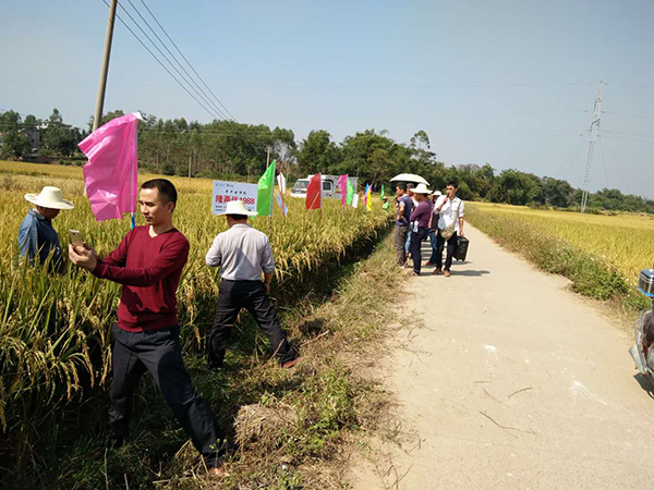 2017年11月3日早晨7點(diǎn)廣西賀州市鋪門(mén)鎮(zhèn)南華村忽然熱鬧起來(lái),原來(lái)是鋪門(mén)鎮(zhèn)隆兩優(yōu)1988經(jīng)銷(xiāo)商陳美香邀請(qǐng)了鋪門(mén)鎮(zhèn)種植大戶(hù)和水稻種植合作社的老板們前來(lái)田間觀摩財(cái)神稻,首先,代理商梁總介紹,這塊田的戶(hù)主是一對(duì)年過(guò)7旬的老人家,因老人家精力不足所以在田間管理與施肥方面相對(duì)缺乏,只靠田塊原本的肥水條件自然生長(zhǎng),但隆兩優(yōu)1988的長(zhǎng)勢(shì)和表現(xiàn)卻遠(yuǎn)遠(yuǎn)超越周邊的其它品種,這使農(nóng)戶(hù)們驚嘆不已!