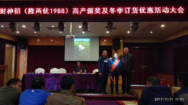 緊接著進(jìn)入激動(dòng)人心的時(shí)刻,財(cái)神稻高產(chǎn)挑戰(zhàn)賽頒獎(jiǎng),經(jīng)過激烈的高產(chǎn)競爭,最終由劉老板等9名種植大戶每人各獲得財(cái)神稻高產(chǎn)挑戰(zhàn)賽高檔電飯煲一臺,看著種植戶滿臉笑容,種財(cái)神稻就對了。最終免費(fèi)坐飛機(jī)游泰國大獎(jiǎng)由流轉(zhuǎn)土地2000畝,2017年財(cái)神稻800畝,平均1600斤/畝,沒有倒伏的譚老板斬獲現(xiàn)場頒獎(jiǎng)結(jié)束,宋總宣布今年財(cái)神稻訂購優(yōu)惠政策,現(xiàn)場預(yù)訂開始,短短20分鐘預(yù)訂10000多斤,最終訂購13000斤。