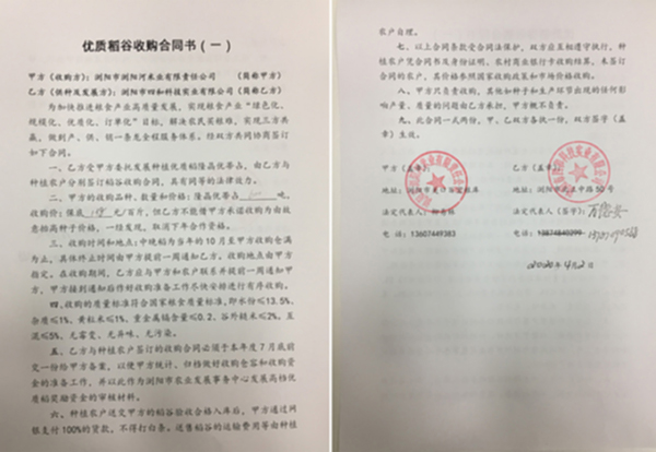 最終,隆晶優(yōu)蒂占在瀏陽(yáng)市的訂單收購(gòu)合同由瀏陽(yáng)河米業(yè)有限責(zé)任公司與瀏陽(yáng)市四和科技實(shí)業(yè)有限公司簽訂,合同約定:由四和科技發(fā)展面積種植該高檔優(yōu)質(zhì)香稻品種,所有符合質(zhì)量標(biāo)準(zhǔn)的該品種稻谷由瀏陽(yáng)河米業(yè)承諾保底138元/百斤收購(gòu)。該合同共約定訂單收購(gòu)隆晶優(yōu)蒂占面積近3000畝。