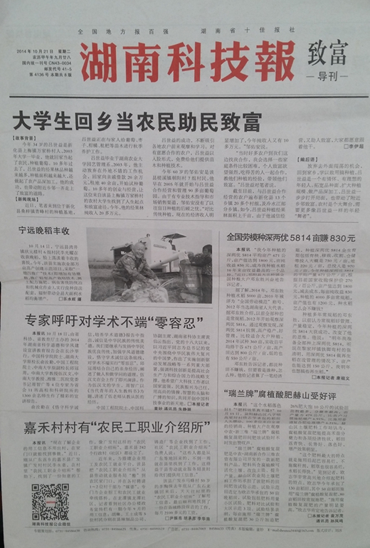 據(jù)了解,2014年,鄧東勝種植水稻5000畝,2010年被評(píng)為“全國(guó)勞動(dòng)模范”稱(chēng)號(hào)、2012年當(dāng)選湖南省人大代表。據(jù)鄧東勝介紹,以前全部種的是常規(guī)稻,2012年開(kāi)始觀(guān)察深兩優(yōu)5814,通過(guò)觀(guān)察發(fā)現(xiàn),深兩優(yōu)5814抗倒、高產(chǎn)穩(wěn)產(chǎn)、好管理,比較適合大戶(hù)種植。2014年試種360畝,實(shí)收后平均得干谷671公斤∕畝,高產(chǎn)田達(dá)到800公斤∕畝,低的也有550公斤∕畝。