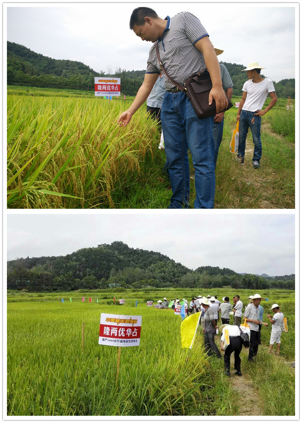 2015年8月11日,在全國著名的“竹木之鄉(xiāng)”、“茶葉之鄉(xiāng)”、“有色金屬之鄉(xiāng)”的臨湘市隆重召開了隆兩優(yōu)華占再生稻觀摩會。上午9點左右,臨湘市隆兩優(yōu)華占零售商、臨湘市農(nóng)業(yè)局相關人員、部分種植大戶將近70人在臨湘市農(nóng)業(yè)局集結(jié)完畢,分別坐上三輛中巴車浩浩湯湯的開往了會議觀摩地點臨湘市五里牌鄉(xiāng),各參會代表到達隆兩優(yōu)華占示范種植田后,大家都迫不及待的俯身在田間數(shù)穗粒數(shù)、看分蘗及結(jié)實率情況。
