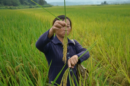 觀摩最后,大家一起觀摩了第三處的一季中稻,據(jù)種植者楊大姐介紹,這十畝田種下去之后基本上沒有管理過,現(xiàn)在來看,一直沒有發(fā)生過病蟲害,也不倒伏,抗性非常好。同時,我們在田間驚訝的發(fā)現(xiàn),即便在缺少肥料的情況下,隆兩優(yōu)華占整體依然挺拔,只是穗子略有變小,粒數(shù)減少,但是其結(jié)實率保持在95%以上!楊大姐表示:明年一定全種隆兩優(yōu)華占,一定管理好,一定種出更高產(chǎn)!