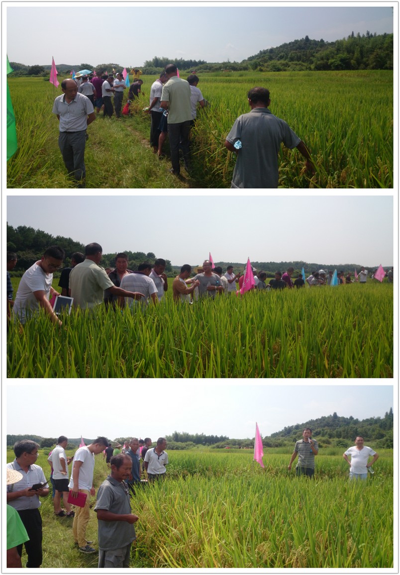 觀摩會現場有白陂鄉(xiāng)、巴山鎮(zhèn)、河上鎮(zhèn)、桃源鄉(xiāng)、許坊鄉(xiāng)等鄉(xiāng)鎮(zhèn)的零售商和種田大戶共60余人,該田塊由石莊鄉(xiāng)詹家村農戶洪勁松(13979443489)種植,由于田塊表現突出,六國肥料公司也選取該田塊為觀摩會場。一到現場,不少種田大戶就下到田里,數分蘗,看稻穗數粒數,場面十分火爆,盡管烈日高照,汗水浸濕了衣服,很多大戶還是耐心、細心的聽取亞華種業(yè)江西分公司李克寬經理對隆兩優(yōu)華占的介紹,這表現出農民是多么期待獲得隆兩優(yōu)華占這樣一個好品種。這期間,一位大戶說道:“你們都是王婆賣瓜,自賣自夸,種這么好的田到底是你們的種子好還是他們的肥料好?”惹的大家都笑起來。李經理笑著回應到:“現在都流行強強聯合,俗話都說,好馬配好鞍,只有品種好了,再以好肥料輔佐,那就有更高的收益,這才是你們農戶選擇我們的初衷嘛。”