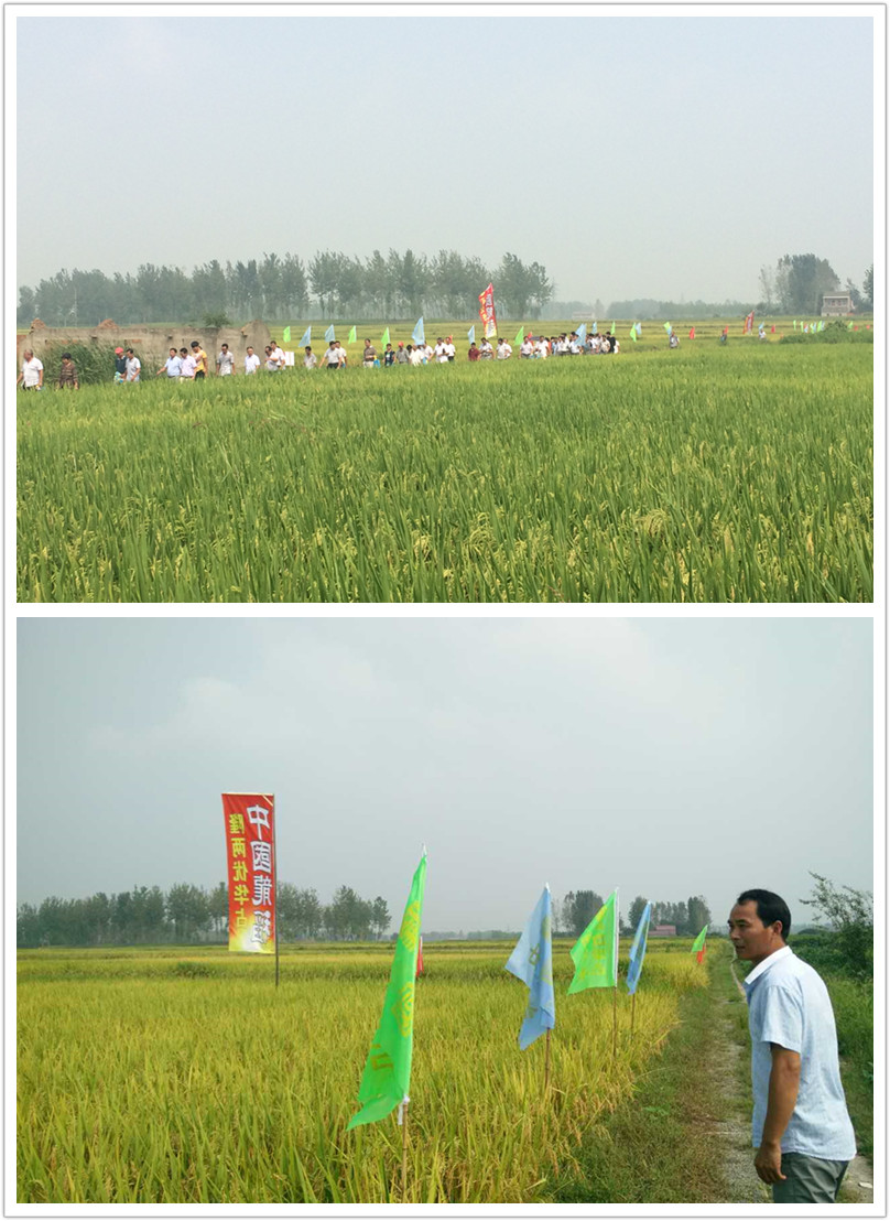 2015年8月29日,在霍邱縣宋店鄉(xiāng)的一片稻田中,166位零售商和種田大戶(hù)參加中國(guó)最強(qiáng)音—隆兩優(yōu)華占現(xiàn)場(chǎng)觀摩會(huì),印有“中國(guó)龍稻 隆兩優(yōu)華占”字樣的超大旗幟在微風(fēng)中飄揚(yáng)。一大群人圍繞著稻田,有的數(shù)分蘗,有的數(shù)稻粒,有的查看是否有空殼或病蟲(chóng)害,他們查看后紛紛豎起大拇指,稱(chēng)贊隆兩優(yōu)華占真心不錯(cuò)!