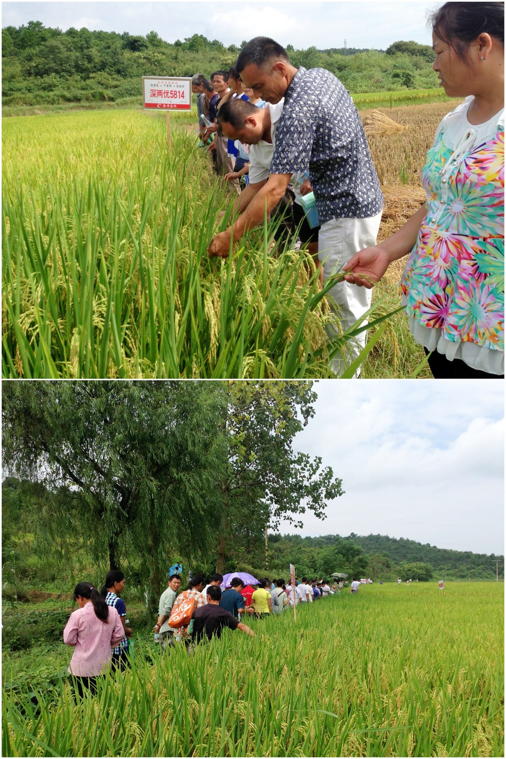 2015年9月4日,祁陽代理商曹寒鐵先生組織祁陽縣100多位鄉(xiāng)鎮(zhèn)種子經(jīng)銷商及種植大戶來到祁陽縣觀音灘鎮(zhèn)聯(lián)興村,現(xiàn)場觀摩該村種植大戶莫學(xué)森連片直播100多畝的農(nóng)業(yè)部超級稻-深兩優(yōu)5814大田,100多號人深入現(xiàn)場,看著金黃的稻穗,大家都說“真正見識到高手種植好品種的現(xiàn)場”,個個夸贊好。種植戶莫學(xué)森介紹說“2014年我也直播了60畝深兩優(yōu)5814,品種表現(xiàn)好,賺了錢,今年擴(kuò)大面積繼續(xù)直播深兩優(yōu)5814,現(xiàn)在田間表現(xiàn)基本穩(wěn)定了,肯定能賺錢”!觀摩的大戶仔細(xì)查看品種表現(xiàn),對照自己的種植的情況,詳細(xì)向種植戶打聽技術(shù),盤算著明年的播種計劃。