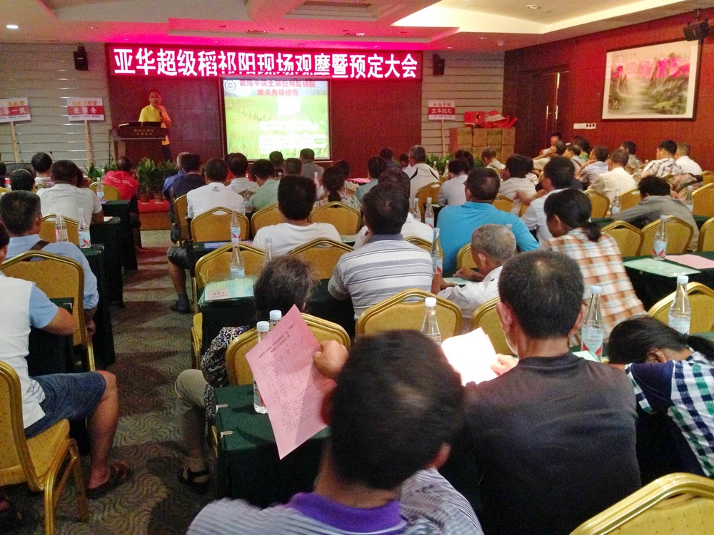 現(xiàn)場觀摩后大家來祁陽四星級酒店-鑫利大酒店會議,進(jìn)行室內(nèi)會議交流和種子現(xiàn)場預(yù)定。預(yù)定大戶由湖南亞華種子有限公司占茂清經(jīng)理主持,會上亞華種業(yè)首席栽培專家王小清向參會人員介紹超級稻深兩優(yōu)5814的特征特性、全國各地表現(xiàn)和栽培技術(shù)要點,讓大戶朋友熟悉品種掌握技術(shù)。最后大會開展預(yù)定工作,經(jīng)銷商朋友積極交款預(yù)定明年銷售品種,大戶朋友更是報上計劃,踴躍交款預(yù)定,現(xiàn)場預(yù)定種子達(dá)11000斤。