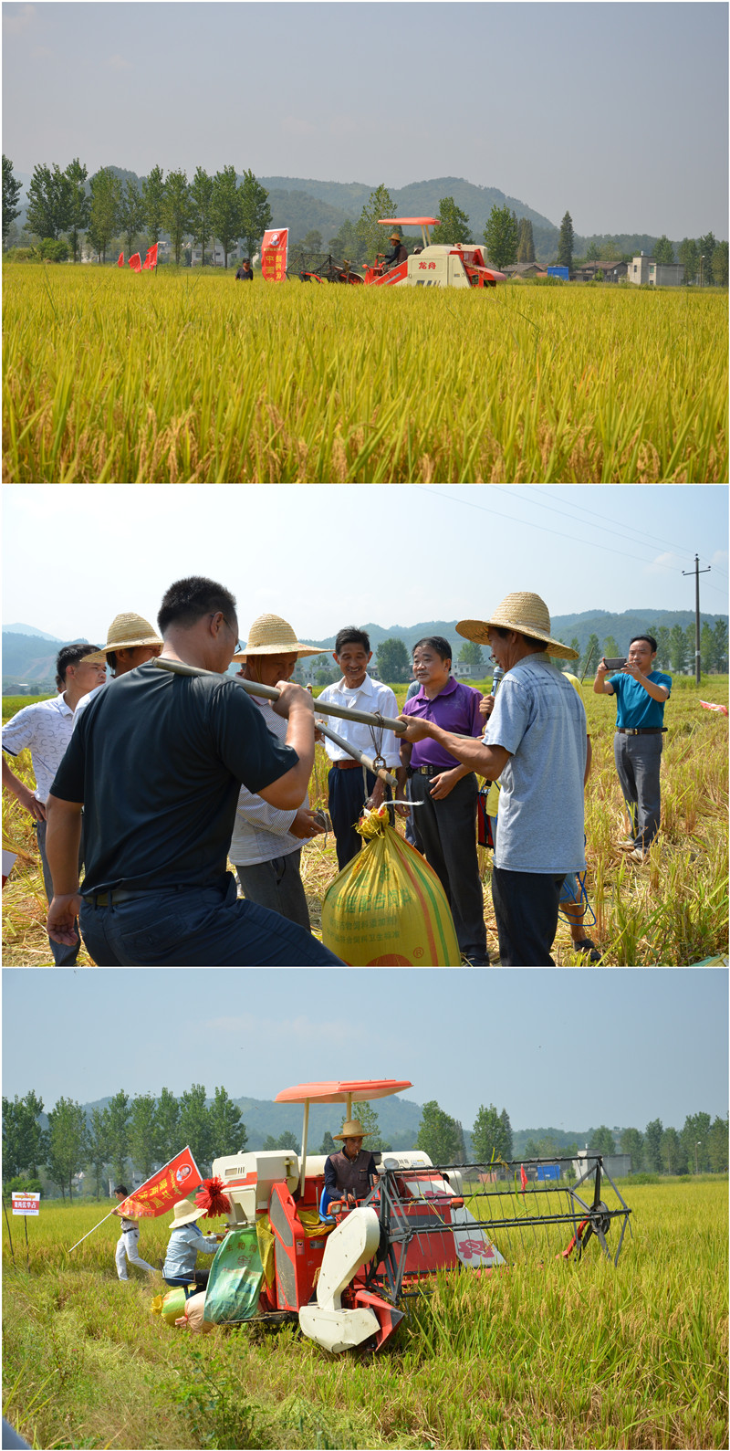 為了讓大家共同鑒證隆兩優(yōu)華占的真實實力,現(xiàn)場進行了收割測產(chǎn)。收割機收割了一塊面積在1.2畝左右的田塊,最終實收濕谷22.5袋,每袋平均93斤,平均畝產(chǎn)1743.75斤,干谷超過1400斤(修水農(nóng)戶種植水平干谷在1000斤左右),獲得了大家的一致好評。該田塊種植戶盧洪玉(電話:15180633212)興奮地說道:“隆兩優(yōu)華占一袋谷子有九十多斤,比其他品種每袋竟然能多出10斤。我買了10斤種子種了11畝田,能達到這樣的產(chǎn)量真是驚喜,要是用足種,產(chǎn)量一定不得了!明年我一定號召村里人都種隆兩優(yōu)華占!”