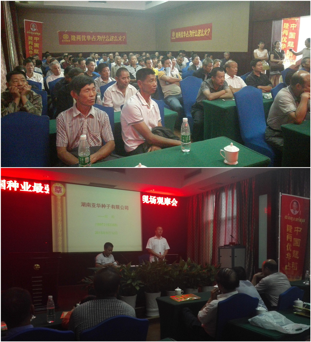觀摩結(jié)束后,室內(nèi)會議在澧縣桃花灘賓館召開,會上,種植戶代表胡定文分享了種植隆兩優(yōu)華占的經(jīng)驗,小渡口經(jīng)銷商劉老板就隆兩優(yōu)華占的特征、特性及適合當(dāng)?shù)氐挠梅N量、栽培管理方式進(jìn)行了分析講解。亞華種業(yè)大區(qū)經(jīng)理劉松就公司發(fā)展及品種的運(yùn)作、市場管理等方面和大家進(jìn)行了講解。最后由澧縣代理商將隆兩優(yōu)華占的預(yù)定優(yōu)惠政策進(jìn)行了解讀,讓農(nóng)戶們能夠種上好品種、獲得好收成!
