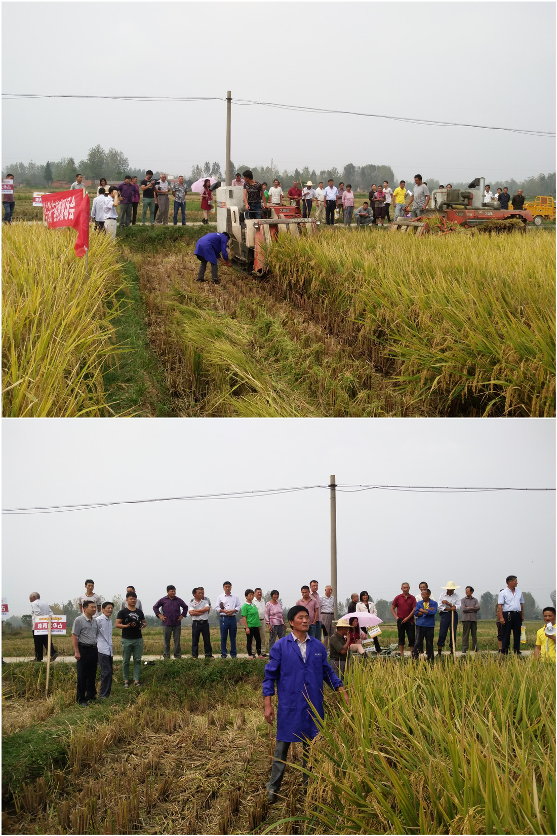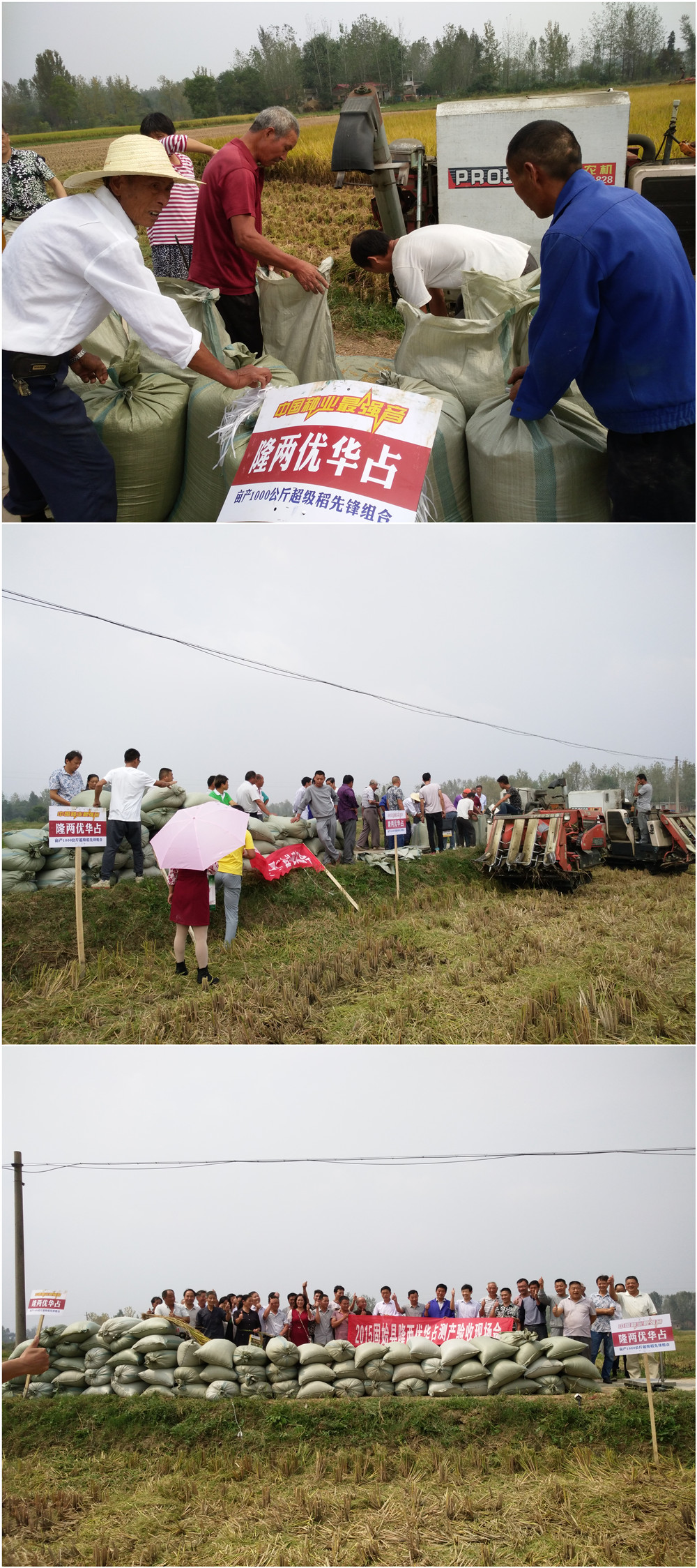 2015年9月19日,40位零售商齊赴郭陸灘鎮(zhèn)圈堰村致富農(nóng)場(chǎng),他們需要在田間考察隆兩優(yōu)華占的種植表現(xiàn),見證現(xiàn)場(chǎng)收割的產(chǎn)量。該田由種田大戶——周志富(15037686538) 4月12日播種,面積30畝,按照大戶栽培模式管理。經(jīng)過了8月27日的龍卷風(fēng)肆虐,已過了成熟期,依然笑立田間,展示著豐收的風(fēng)采。