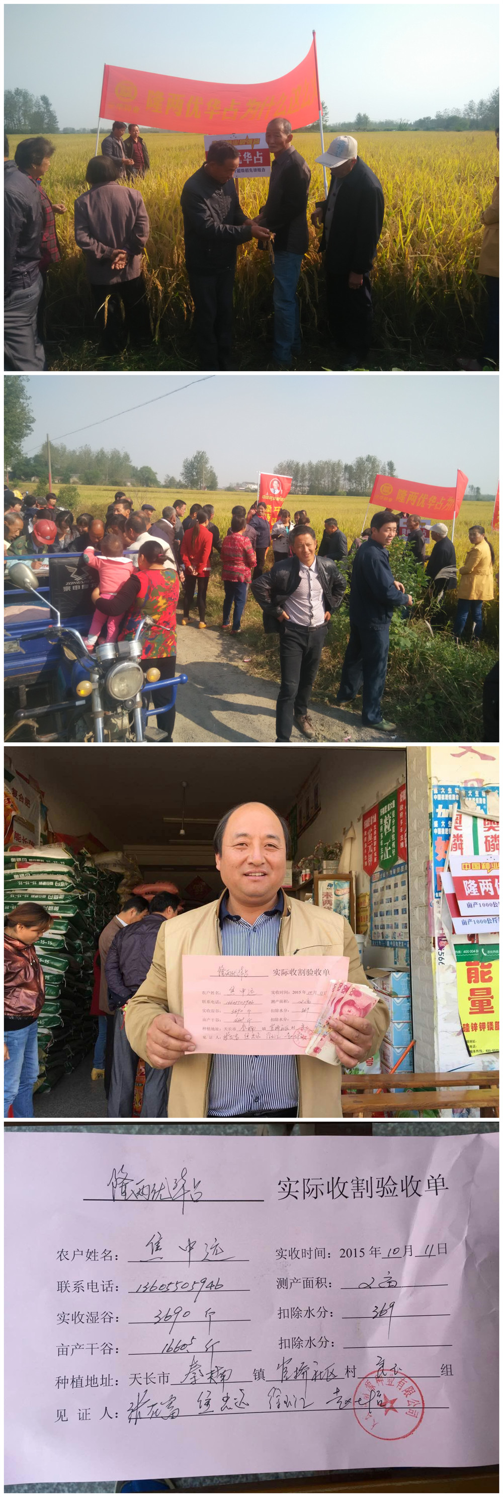 經(jīng)過半個小時的收割,這片2畝的田塊,實收稻谷3690斤,出去水分折合干谷1660.5斤。種植戶焦中遠喜上眉梢,,本以為能收到1400斤,實際干谷收了1660.5斤!沒有想到隆兩優(yōu)華占竟有這樣高的產(chǎn)量。來參觀的零售商們特別稱贊麥茬田能有這樣高的產(chǎn)量在整個天長都不多,非常認可隆兩優(yōu)華占的穩(wěn)產(chǎn)高產(chǎn)特性,稱贊隆兩優(yōu)華占分蘗能力強,無病蟲害,抗倒伏能力強,結實率高。是災年穩(wěn)產(chǎn),豐年高產(chǎn)的超級好品種!