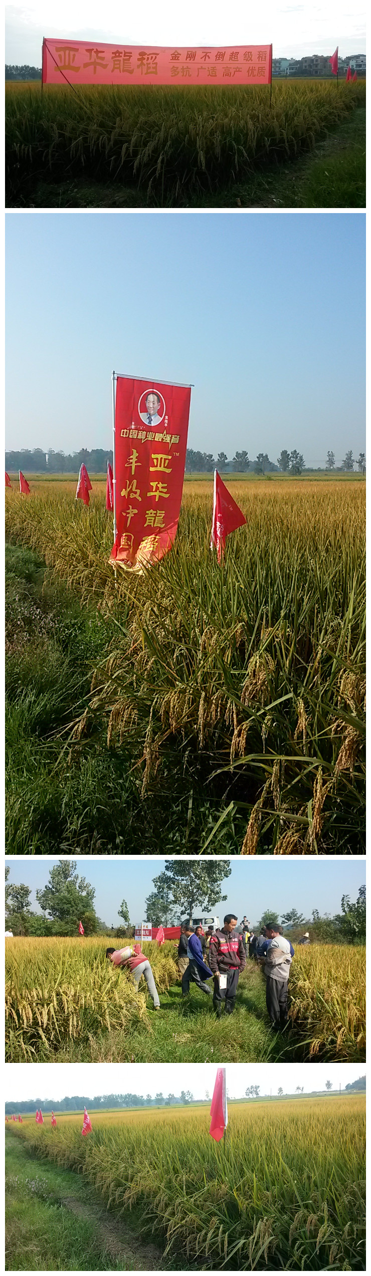 2015年10月15號(hào),在江西萬(wàn)年縣湖云鄉(xiāng)白馬村,迎面而來(lái)的是彩旗飄飄、稻浪滾滾的示范田,就在這番美景之中順利召開(kāi)了亞華龍稻現(xiàn)場(chǎng)觀摩會(huì)。人們不由自主地下到田邊、田中去近距離地觀看和親近這美景。人們仔細(xì)地觀看后說(shuō):“這品種結(jié)實(shí)率真高!到穗頸處的谷粒都是個(gè)個(gè)飽滿”“亞華龍稻的發(fā)蔸能力真強(qiáng),平均有15根,按照這田間表現(xiàn)收割定是大豐收”!