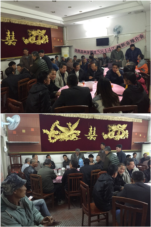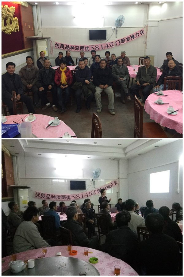 2015年12月30日,湖南亞華種子有限公司聯(lián)合代理商在江門市新會區(qū)小岡鎮(zhèn)召開深兩優(yōu)5814推介會。參會人數(shù)共41人,基本是種植面積在50畝以上的水稻種植專業(yè)戶,最大的專業(yè)戶種植面積有500多畝。會上,各位水稻種植專業(yè)戶認真聽取了深兩優(yōu)5814高產(chǎn)穩(wěn)產(chǎn),米質(zhì)優(yōu)良,抗性好等特性介紹及栽培技術(shù)要點等。