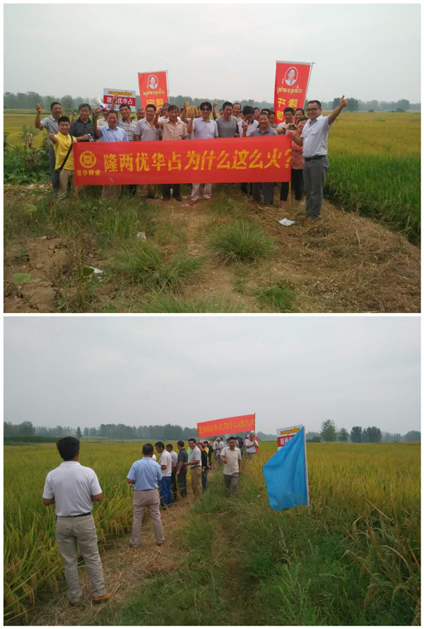 2016年9月5日,定遠興農種業(yè)在程橋組織召開了一場聲勢壯大的觀摩預訂會議,與會者90余人。會議伊始,由種植農戶帶領,大家一同至附近的隆兩優(yōu)華占田塊中,進行現場觀摩,農戶們三兩成群,摸摸稻穗,捏捏稻籽,交流甚歡。當地農業(yè)技術專家張學道老師在現場為農戶做了品種特性及栽培技術方面的詳細介紹。面對滿田金黃的稻穗,各位種田里手都笑容滿面,頻頻稱贊。程橋零售商李仁連興奮地向大家說“今年所有的水稻品種中,隆兩優(yōu)華占結實率最高,表現最好”。