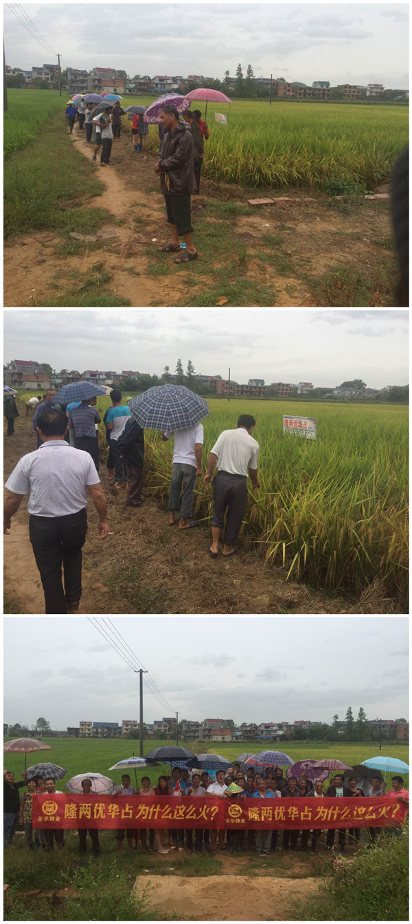 2015年9月28號,受臺風(fēng)“鲇魚”的影響,江西省各管轄市基本都淪陷于狂風(fēng)暴雨中。盡管風(fēng)雨再大,也阻擋不了種植戶對豐收的渴望。上午十點左右,貴溪市泗瀝鎮(zhèn)迎來了各個鄉(xiāng)鎮(zhèn)的40多位零售商和種植大戶,來參加由湖南亞華種業(yè)組織的中國種業(yè)超強音——隆兩優(yōu)華占觀摩會。
