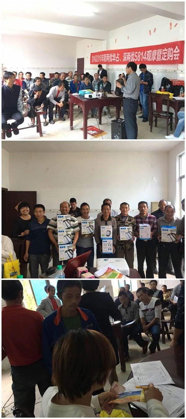 一大早各鄉(xiāng)鎮(zhèn)零售商帶上種植大戶前往觀摩田觀摩深兩優(yōu)5814和隆兩優(yōu)華占今年的大田表現(xiàn),有了對比才有選擇。今年很多品種受天氣影響收成不好,深兩優(yōu)5814自推廣以來一直穩(wěn)產(chǎn)保收,深受廣大農(nóng)戶喜愛,種來種去,最終還是選擇深兩優(yōu)5814。隆兩優(yōu)華占推廣兩年來,面積逐年增大,經(jīng)過了市場的檢驗,也逐漸成為了老表首選的品種。在室內(nèi)會議上,亞華種業(yè)鄒容經(jīng)理就深兩優(yōu)5814和隆兩優(yōu)華占今年的形勢和表現(xiàn)做了詳細(xì)的介紹,吉水縣代理商也對今年吉水市場上各品種的情況做了比較,最終還是選擇了深兩優(yōu)5814和隆兩優(yōu)華占作為主推。