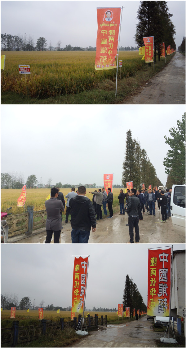 潁上經(jīng)歷了持續(xù)一周的連綿陰雨,在10月25日這個(gè)特別的日子,龍王收斂了密布的烏云,為皖蘇兩省經(jīng)銷商參觀百畝隆兩優(yōu)華占鋪路讓行。早晨8:30,參觀車隊(duì)一路高歌凱進(jìn),馳行30公里,來(lái)到了位于潁上縣謝橋鎮(zhèn)新橋村的109畝連片隆兩優(yōu)華占大田,現(xiàn)場(chǎng)早已是各式彩旗迎風(fēng)招展、沉甸甸稻穗隨風(fēng)搖晃,好一幅完美大田長(zhǎng)勢(shì)、高產(chǎn)豐收在望的壯麗景象。