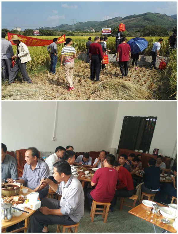 早上八點(diǎn),全體人員集結(jié)完畢,6部汽車帶著我們向石羅前進(jìn)。汽車在美麗的鄉(xiāng)間公路前行,一路的風(fēng)景美如畫,經(jīng)過一個小時的行程,我們到達(dá)了此次田間的會場。我們向著隆兩優(yōu)華占田塊前行,零售商們紛紛走進(jìn)田間,仔細(xì)地觀察隆兩優(yōu)華占田間的表現(xiàn),有的拉著稻穗,看稻穗的長度并數(shù)粒數(shù),有的扒開稻株觀察病蟲害情況,有的忙著與稻谷合影,有的在田間來回走動,拿隆兩優(yōu)華占與旁邊的其他品種做對比。今年晚稻整個廣西雨季偏多,很多品種得病很嚴(yán)重,特別是稻曲病最為嚴(yán)重,但隆兩優(yōu)華占這邊表現(xiàn)干干凈凈,比旁邊的其他品種表現(xiàn)好很多。大家都稱贊這個品種抗性真的很好。有位零售商跟我說:這個隆兩優(yōu)華占相對其他品種,最大的優(yōu)勢是豐產(chǎn)性和抗性,我做了三年示范了,年年表現(xiàn)很好。在田間會場,貴港代理商簡單介紹隆兩優(yōu)華品種特性,以及他經(jīng)過這三年的跟蹤觀察的感受和了解,他認(rèn)為如果目前市場上大力推廣的晶兩優(yōu)和隆兩優(yōu)系列是桂楠晚稻的明星品種,那么隆兩優(yōu)華占就是這兩個系列品種里最耀眼的明星。