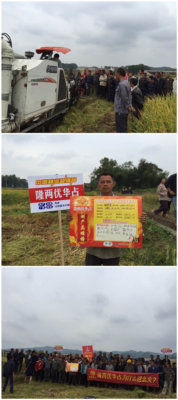 在湖源村,放眼望去,到處都是金黃的隆兩優(yōu)華占,很是壯觀!不管是直播田還是移栽田,田里的隆兩優(yōu)華占表現(xiàn)都相當(dāng)優(yōu)秀。種田大戶湯錫勇種植了200畝隆兩優(yōu)華占,在經(jīng)歷了連續(xù)高溫天氣和臺(tái)風(fēng)的洗禮,田里的隆兩優(yōu)華占終于等到了收獲的時(shí)候,我們現(xiàn)場(chǎng)收割0.6,實(shí)收濕谷1093.8斤,合畝產(chǎn)1823斤,扣除15%水分, 折合畝產(chǎn)干谷1549.5斤,種植戶高興的說:“今年種隆兩優(yōu)華占賺到錢了,不錯(cuò)!”連開收割機(jī)的師傅都說:“隆兩優(yōu)華占太火了,我在安徽、湖北、江西好多地方都收割了這個(gè)品種,產(chǎn)量都很不錯(cuò),1700、1800斤都很常見,我明年也要種隆兩優(yōu)華占”。