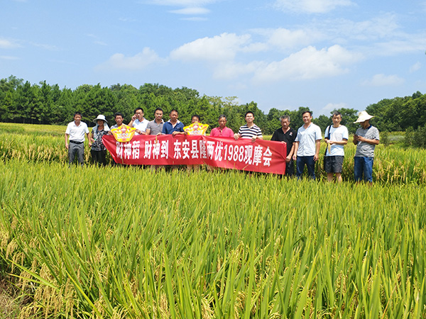 2017年8月17日,由東安縣經(jīng)銷商肖友安在永州市東安縣井頭圩鎮(zhèn)陳巖塘主持召開了隆兩優(yōu)1988的經(jīng)銷商觀摩會(huì)議。參加此次會(huì)議的人員有東安縣知名種子經(jīng)銷商肖友安、亞華種業(yè)百分農(nóng)業(yè)湘南大區(qū)區(qū)域經(jīng)理毛旭東、亞華種業(yè)百分農(nóng)業(yè)湘南大區(qū)區(qū)域經(jīng)理羅琳輝、種田大戶張嫂以及東安各地零售商20余人。