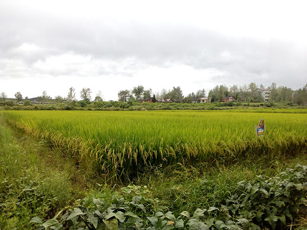 8點(diǎn)半左右在聶老板帶領(lǐng)下,大家來到萬店示范田塊觀摩。葉青籽黃是大家看到示范田塊的第一印象!該示范田播種在四月中下旬,全程高溫抽穗、揚(yáng)花,結(jié)實(shí)率可達(dá)90%,田間清秀、株型挺拔、緊湊。