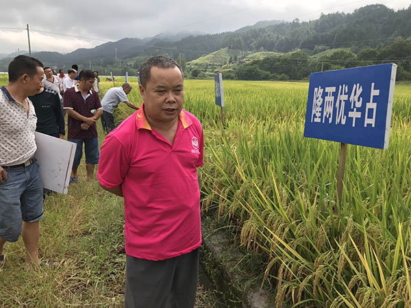 2017年8月30日上午,新晃縣亞華種業(yè)代理商吳克云在扶羅鎮(zhèn)組織了隆兩優(yōu)華占觀摩會(huì),前來觀摩的有農(nóng)業(yè)局領(lǐng)導(dǎo)、亞華種業(yè)婁懷區(qū)域經(jīng)理何少海、鄉(xiāng)鎮(zhèn)種子零售商及種田大戶。當(dāng)日烏云密布,但絲毫沒有影響大家的熱情。看著插有隆兩優(yōu)華占示范牌的田塊,所有人的目光都被它又長又多的穗子吸引,種植戶得意地說,“從來沒有種過產(chǎn)量這么高的,今年是選對(duì)種了,這2畝田少說要收3000斤谷”。