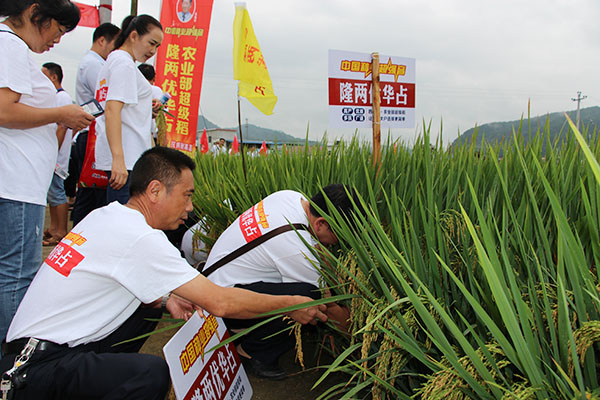 2017年 9月10日,在貴州省都勻市平浪鎮(zhèn)河?xùn)|村,由湖南亞華種業(yè)有限公司主辦的“豐收傳奇 你我見(jiàn)證——隆兩優(yōu)華占貴州省級(jí)觀摩測(cè)產(chǎn)現(xiàn)場(chǎng)會(huì)”,在一場(chǎng)品種產(chǎn)量有獎(jiǎng)競(jìng)猜活動(dòng)中拉開(kāi)帷幕,由貴州省黔南州三名高級(jí)農(nóng)藝師、媒體記者以及150多名種業(yè)經(jīng)銷商組成的見(jiàn)證團(tuán),對(duì)隆兩優(yōu)華占進(jìn)行了現(xiàn)場(chǎng)測(cè)產(chǎn)驗(yàn)收,產(chǎn)量驚人!畝產(chǎn)高達(dá)1820.64斤,這個(gè)產(chǎn)量足足比農(nóng)戶種植的一般品種高出四五百斤。三名水稻專家在隆兩優(yōu)華占測(cè)產(chǎn)英雄榜上共同簽字確認(rèn),150多名經(jīng)銷商也紛紛簽字見(jiàn)證并留影,被媒體記者抓拍到了這個(gè)見(jiàn)證奇跡誕生的精彩時(shí)刻!