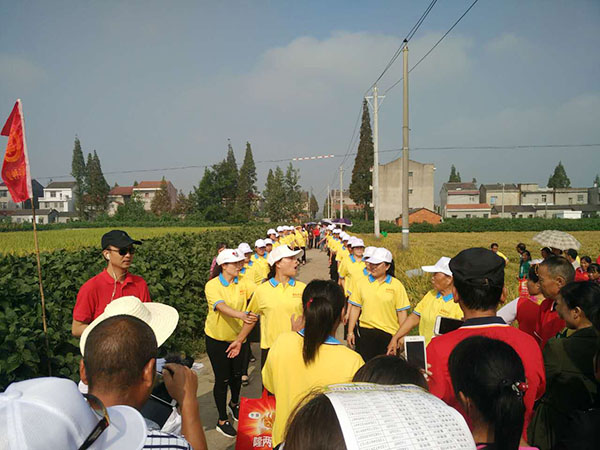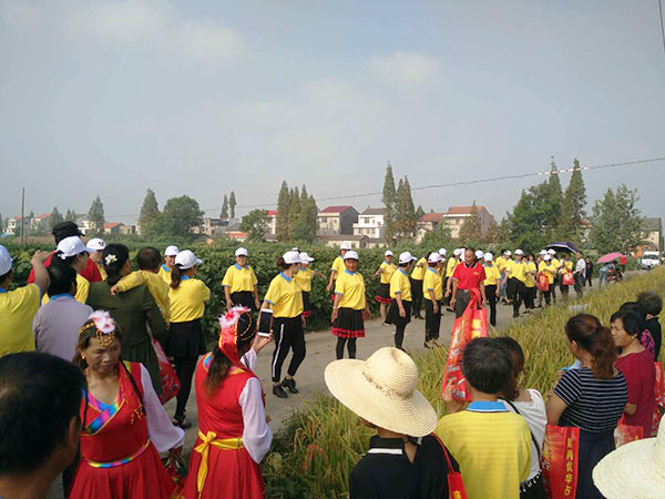 會場的氣氛好不火爆,荊州電視臺至此進行全程的跟蹤報道,雙機位加航拍的豪華配置,好像在擔(dān)心會錯過任一細節(jié)。看!田邊突然出現(xiàn)一道金黃靚麗的風(fēng)景線,走近一看,原來是云集的跳舞大媽前來以舞慶祝!這,就是隆兩優(yōu)華占的測產(chǎn)觀摩會!