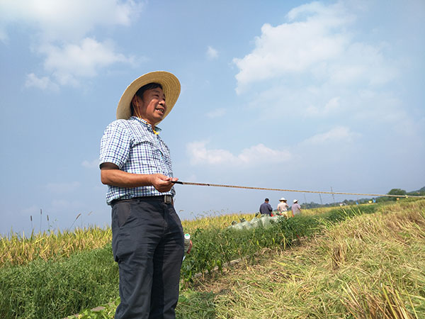 接下來是實測收割田塊面積,“那里沒扯到頭啊,放到邊上”,“怎么沒拉直啊,斜了斜了,擺直些”,“中間皮尺被稻樁撐起來了,把它弄下去,拉直了”。整個測量過程中驗收組專家們一直非常嚴謹,頂著下午的烈日,站在田埂里三個小時,直到完成田間收割工作。